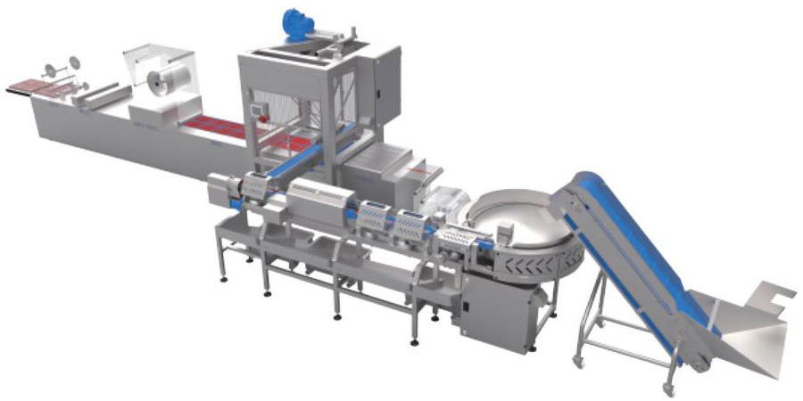 2.自動(dòng)整列輸送機(jī):將每根香腸排列整齊并保持一定的間隔,自動(dòng)檢測(cè)腸類規(guī)格將不符合包裝要求的腸類剔除,再將香腸整齊排列到蜘蛛手機(jī)器人抓取線上。
